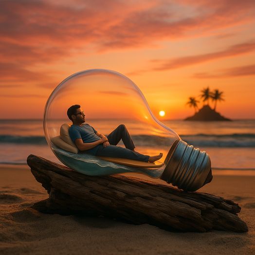 "Bức ảnh phong cảnh siêu thực của một tấm đèn lớn trong suốt nằm trên đỉnh một mảnh gỗ trôi trên bãi cát. Đèn nghiêng nhẹ sang phải, bên trong đèn hướng về phía bên phải của hình ảnh. Bên trong tấm đèn, có một người nằm trên gối, trước mặt hai chân ra. Người mặc áo xanh và có vẻ đang ngủ. Phông nền cho thấy hoàng hôn tuyệt đẹp trên đại dương, với hòn đảo nhỏ với cây cọ nhìn thấy ở xa. Bầu trời là sự pha trộn giữa sắc cam, hồng và tím, tạo nên một bầu không khí ấm áp và yên bình. Nước êm đềm phản chiếu màu trời."