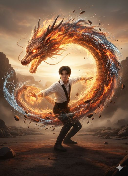 Hyper-realistic 8K cinematic up-close photo of me performing an avatar bending stance outdoors. A swirling ring of all four elements—earth, air, water, and fire—surrounds me, forming a dragon with claws, whiskers, and dramatic twists. The dragon appears alive, flowing from my hands, captured with natural physics elements: water droplets, splashes, refractions, mist, rocks, dust, pebbles, wind, flames, embers, and sparks.