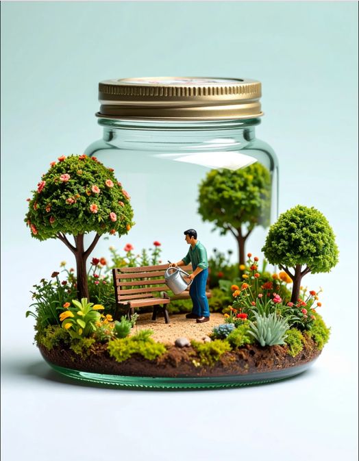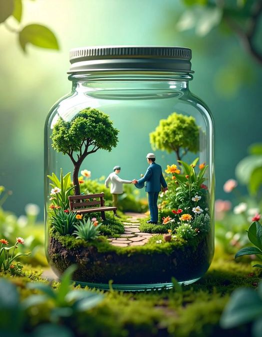 Một mô hình thu nhỏ (diorama) cực kỳ chi tiết bên trong một chiếc lọ thủy tinh trong suốt có nắp kim loại, đặt giữa khu rừng xanh tươi. Bên trong lọ là một khung cảnh công viên nhỏ với con đường lát đá, băng ghế gỗ, những bông hoa đang nở rộ và hai người tí hon đang bắt tay dưới một gốc cây. Xung quanh là lớp rêu mềm mại, hoa dại đủ màu và cây xanh tươi tốt. Hậu cảnh mơ màng với ánh nắng tự nhiên xuyên qua kẽ lá, tạo nên không khí yên bình, huyền ảo và đầy chất thơ. Phong cách ảnh macro siêu thực, ánh sáng điện ảnh, tông màu ấm, hiệu ứng bokeh nhẹ.