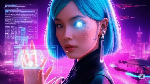 "8K render, Y3K futuristic style portrait of a Vietnamese woman, 30 years old, a cyber designer, with neon blue hair (5cm long), glowing cybernetic eye, and holographic earrings, interacting with a floating AI interface. Background features a cyberpunk Ho Chi Minh City skyline with flying cars and neon lights, under a vibrant purple and pink neon glow. The scene captures the excitement of Vietnam’s Tech Innovation Day, May 26th, 2025. Include user’s face, ultra-detailed, vivid colors, with a cinematic depth of field focusing on the woman."