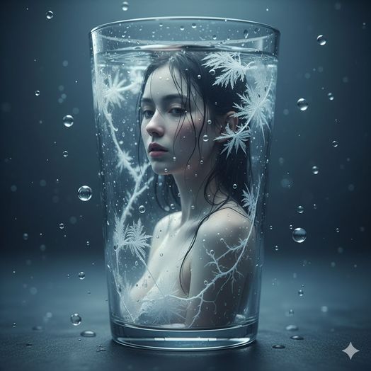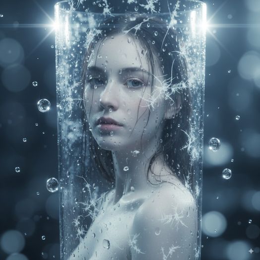A hyper-realistic, surreal cinematic portrait of a young woman trapped inside a tall, crystal-clear glass filled with water droplets and delicate white frost-like patterns forming intricate, web-like veins around her. Her soft, pale skin glows under moody, cold lighting, and her dark, wet hair clings gently to her face and neck. Tiny floating water bubbles surround the glass, reflecting light beautifully.The atmosphere is mysterious, dreamlike, and ethereal, with a bokeh effect in the blurred background. Ultra-detailed 8K, volumetric lighting, high contrast, depth of field, cinematic tone, photorealistic rendering.