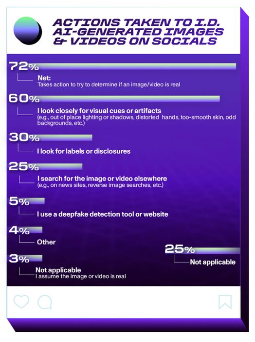 Khi các chỉ số hình ảnh của AI biến mất, các hình thức xác minh nội dung khác ngày càng trở nên quan trọng. Hai phương pháp phổ biến tiếp theo là kiểm tra nhãn dán hoặc thông tin tiết lộ (30%) và tìm kiếm nội dung đó ở những nơi khác trên mạng (25%), chẳng hạn như trên các trang tin tức hoặc thông qua tìm kiếm hình ảnh ngược. Chỉ 5% người phản hồi cho biết họ sử dụng một công cụ hoặc trang web phát hiện deepfake.