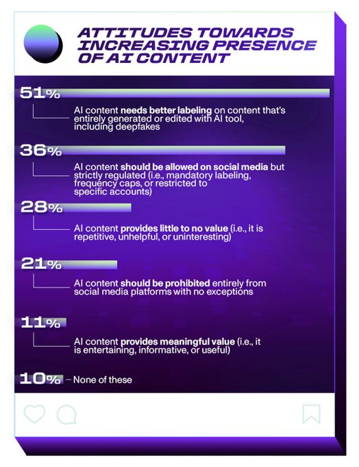 Nhưng 21% người phản hồi tin rằng nội dung AI nên bị cấm hoàn toàn trên mạng xã hội, không có ngoại lệ. Con số đó cao nhất ở Gen Z với 25%. Khi được hỏi liệu họ có tin rằng nội dung AI nên được cho phép nhưng phải được quản lý chặt chẽ hay không, 36% trả lời có. Tỷ lệ thấp này có thể được giải thích bởi thực tế là chỉ có 11% thấy nội dung AI mang lại giá trị có ý nghĩa -- rằng nó mang tính giải trí, thông tin hoặc hữu ích -- và 28% nói rằng nó mang lại ít hoặc không có giá trị gì.