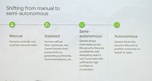 Lộ trình của Google Cloud hình dung sự tiến triển qua bốn giai đoạn: Thủ công, Hỗ trợ, Bán tự động và Tự động hóa các hoạt động bảo mật. Trong giai đoạn bán tự động, các hệ thống AI sẽ xử lý các tác vụ thường ngày trong khi chuyển các quyết định phức tạp cho người vận hành. Giai đoạn tự động hóa cuối cùng sẽ chứng kiến AI "thúc đẩy vòng đời bảo mật đạt được kết quả tích cực thay mặt người dùng."