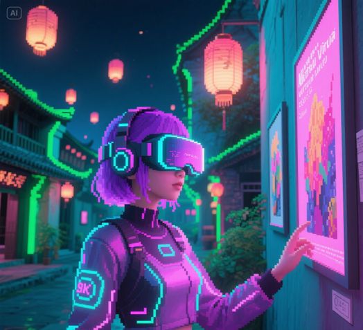 "8K render, metaverse aesthetic style portrait of a Vietnamese avatar, 20 years old, with glowing purple hair, wearing a VR headset and a futuristic outfit, interacting with a virtual art gallery. Background features a digital Hoi An ancient town with floating lanterns, under a neon green and pink glow. The scene celebrates Vietnam’s Virtual Culture Expo. Include user’s face, ultra-detailed, pixelated effects, with a holographic depth of field."