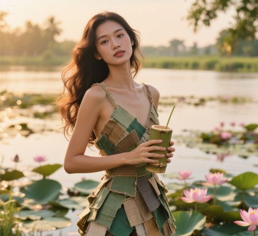 "6K render, eco-friendly fashion style portrait of a Vietnamese model, 25 years old, with long wavy hair, wearing a dress made from recycled materials, holding a bamboo reusable cup. Background features a lush Mekong Delta with lotus ponds, under natural golden sunlight. The scene promotes Vietnam’s Green Living Festival, May 2025. Include user’s face, highly detailed, earthy tones, with a soft bokeh effect."
