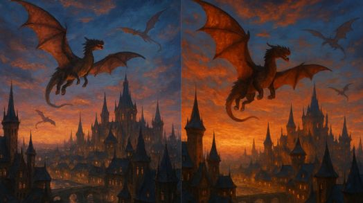 Thử nghiệm thứ hai hoàn toàn là về sự sáng tạo. Tôi yêu cầu với vai trò một họa sĩ đang tìm kiếm một bức ảnh tham khảo không tồn tại, và tôi đã yêu cầu hai chế độ Copilot tạo ra một thành phố giả tưởng vào lúc chạng vạng, tràn ngập rồng và bầu trời buổi tối đầy kịch tính.