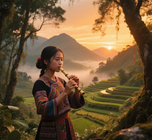 "6K render, Vietnamese folklore style scene of a mythical forest near Sapa, featuring a young H’mong girl, 18 years old, in traditional embroidered clothing, playing a khèn (bamboo flute). Background includes terraced rice fields and a misty mountain, under a warm amber sunset glow. The scene evokes the magic of Vietnam’s H’mong New Year. Highly detailed, rich cultural textures, with a dreamy depth of field focusing on the girl."